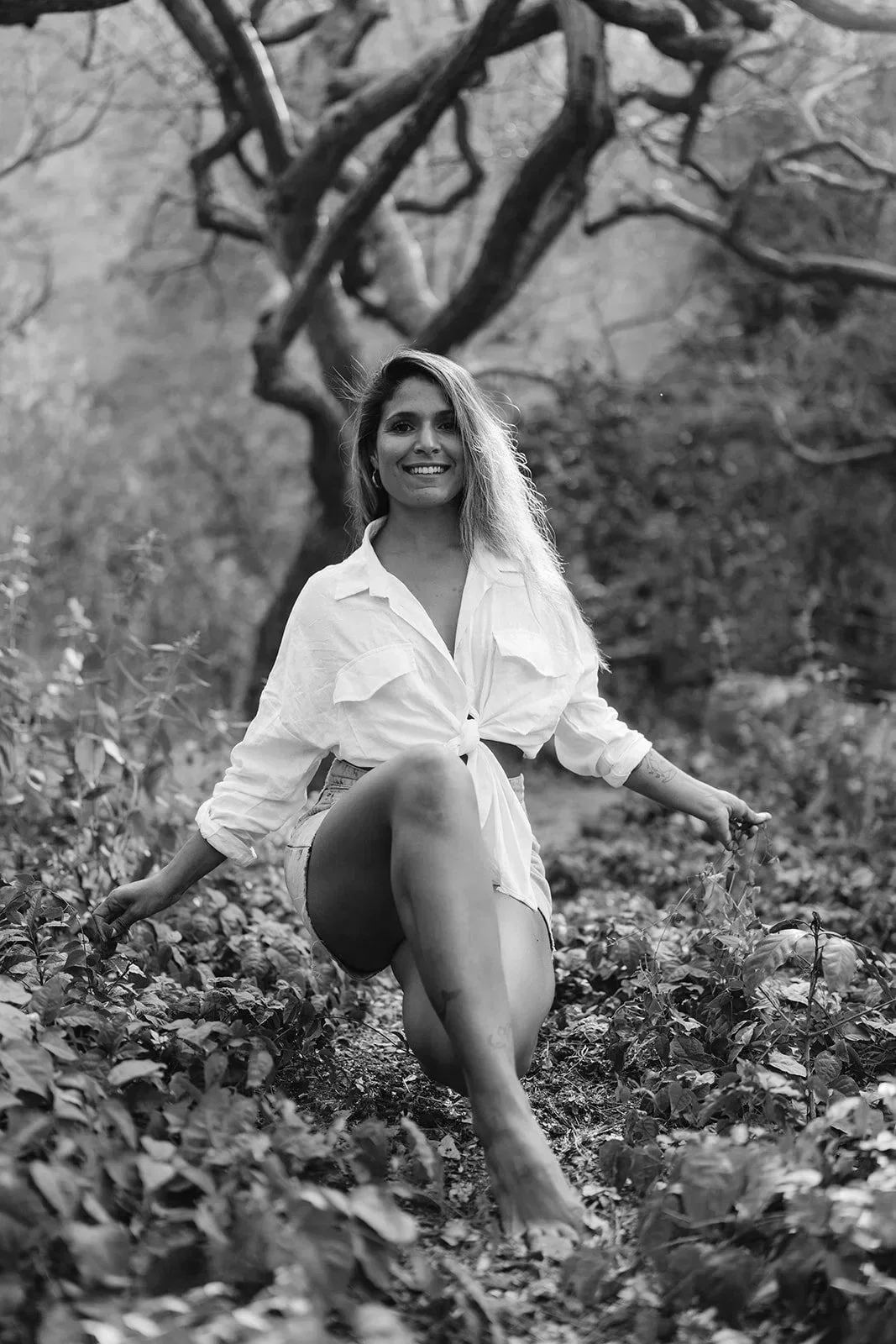 A smiling woman in a white shirt and shorts kneeling outdoors on a forest floor, with large trees and foliage in the background, captured in black and white.