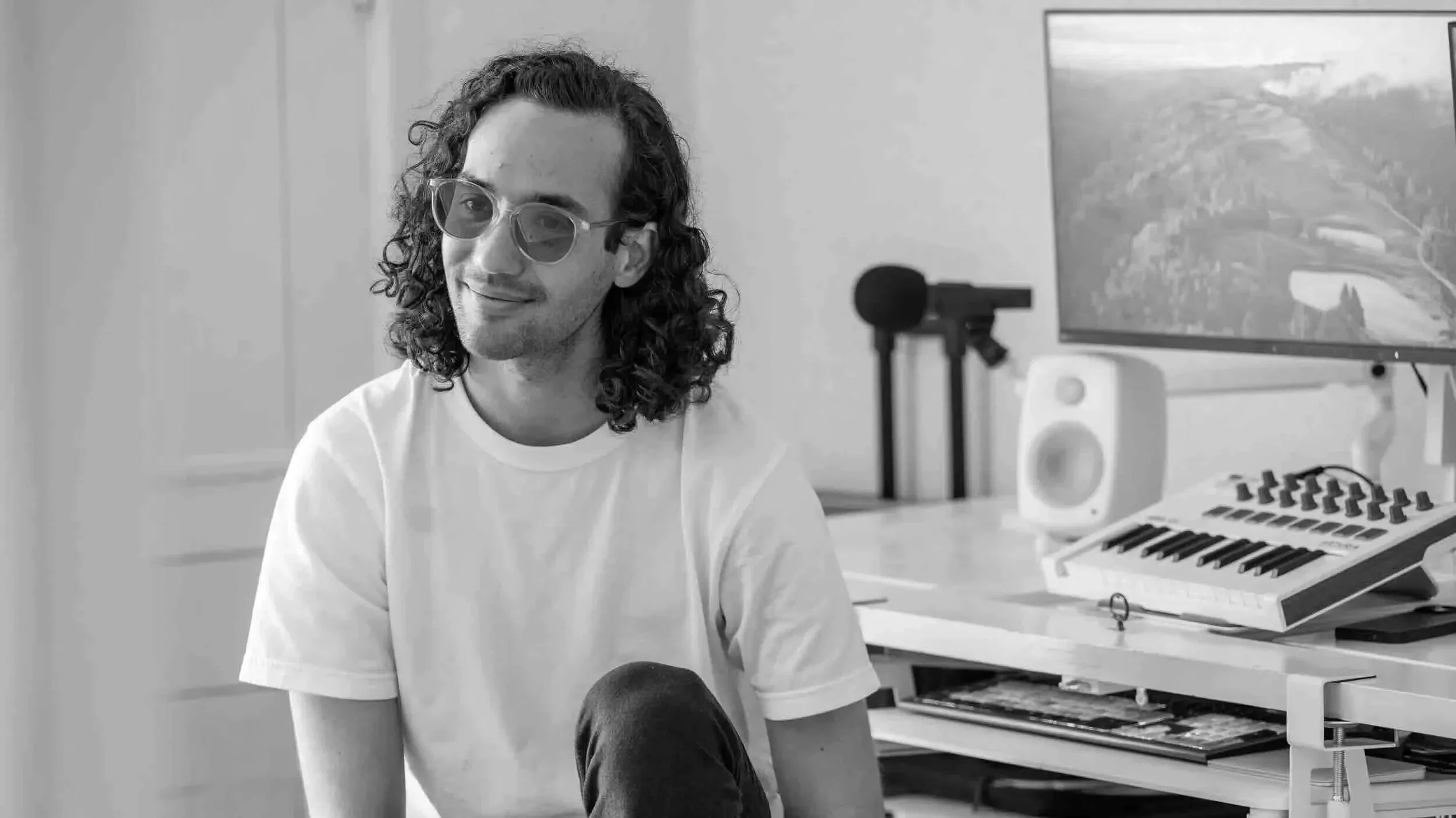 A person with curly hair, sunglasses, and a white t-shirt sitting in a music studio surrounded by equipment including a computer monitor, speakers, and a MIDI keyboard.